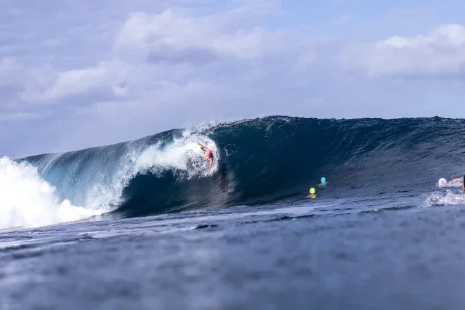 Stewart and Cunningham predictably placed one and two in the event, followed closely behind by Kai Santos, Bryan Phillips, Todd Sells, and Mel Keawe. Yet every heat felt like a raw display of human shapes embodying ocean waves. At times, the distinction between man and water disappeared altogether. In his poem, “Ocean Birth,” contemporary Māori poet Robert Sullivan writes: “Every wave carries us here—every song to remind us—we are skin of the ocean.” The poem was conceived as sort of a unifying clarion call to all Pacific Islanders. It could just as well have been written for bodysurfers